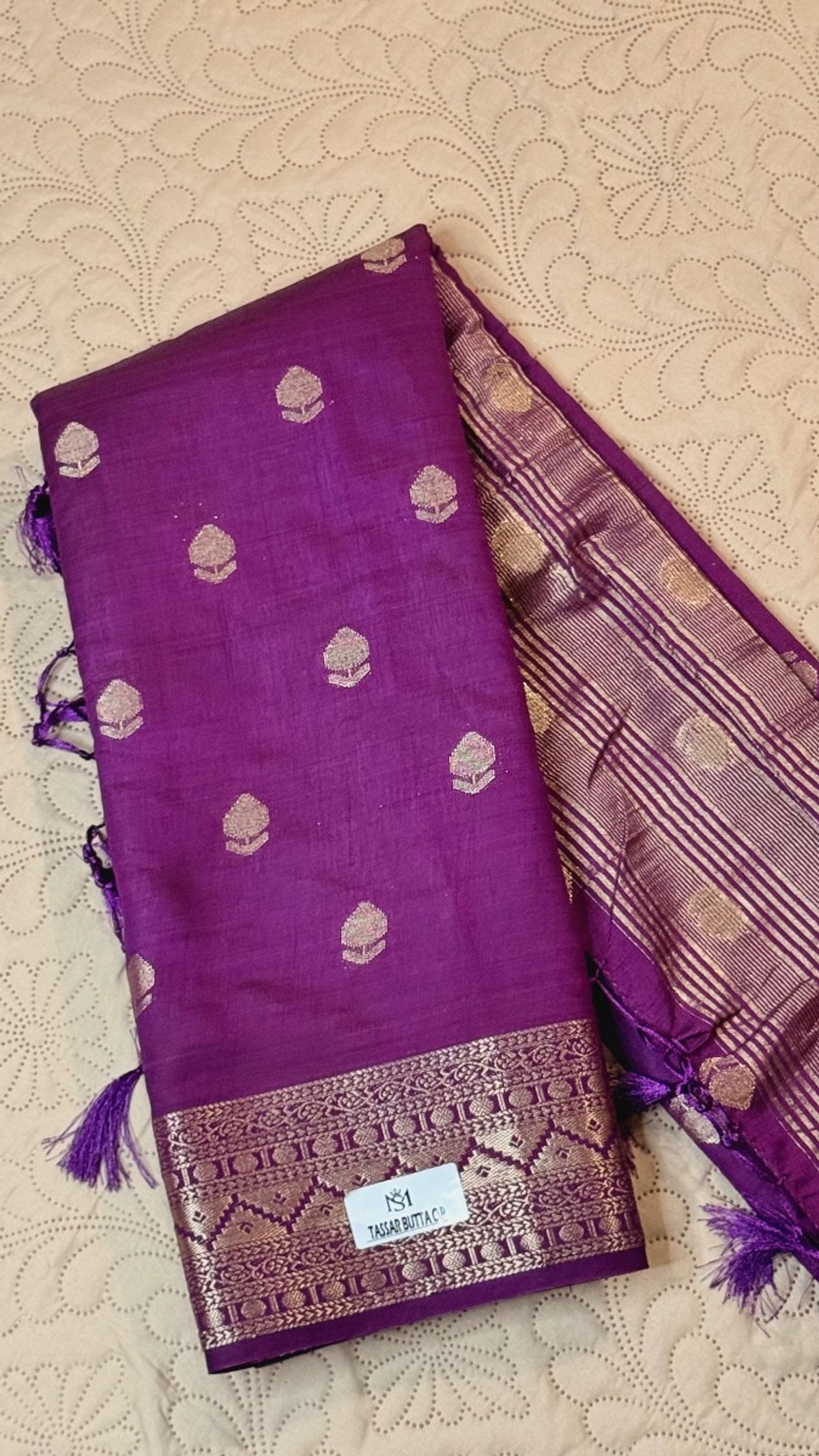 This saree exudes rich elegance with its deep royal purple base, beautifully highlighted by delicate gold zari buttas scattered across the body. The border features intricate traditional weaving in soft gold tones without overpowering the look. The pallu stands out with fine vertical zari stripes and subtle woven motifs, finished with handcrafted tassels that enhance its graceful fall.Suitable for festive and occasion wear 🌸✨