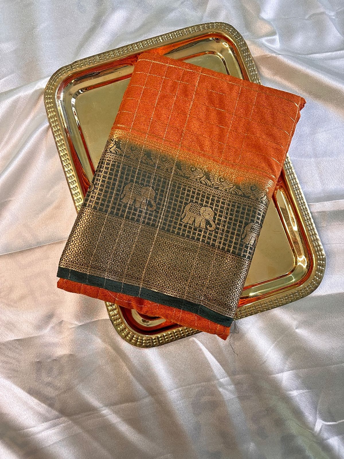 This saree features a rich mustard yellow body woven with fine subtle checks, giving it a refined and elegant texture. The highlight is its contrasting dark green and antique gold zari border, intricately designed with traditional elephant motifs and geometric patterns that add a regal South Indian charm. Finished with a slim contrasting edge, the saree balances vibrancy with heritage aesthetics.